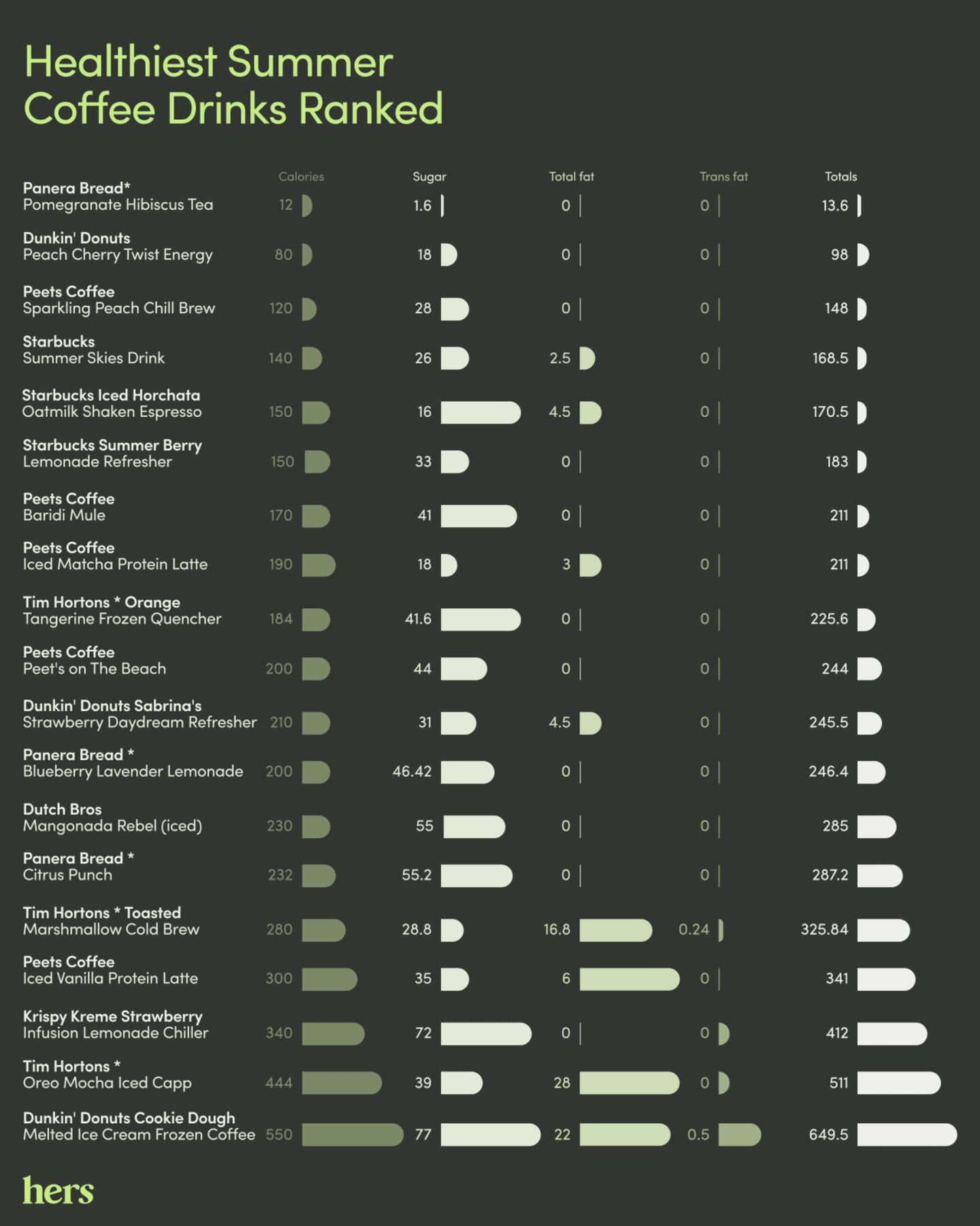 While an orange-flavored energy drink or a protein latte seem like the right choice for a quick caffeine boost, these beverages often have hidden sugar or high fat content. That's why Hers analyzed the nutrition data of the summer menus from the largest U.S. fast food and cafe chains. A large majority of the drinks contain more than 30 grams of sugar, but a few are healthier than meets the eye. Read on to learn more about where to find the healthiest options and which drinks are better suited as an occasional treat.