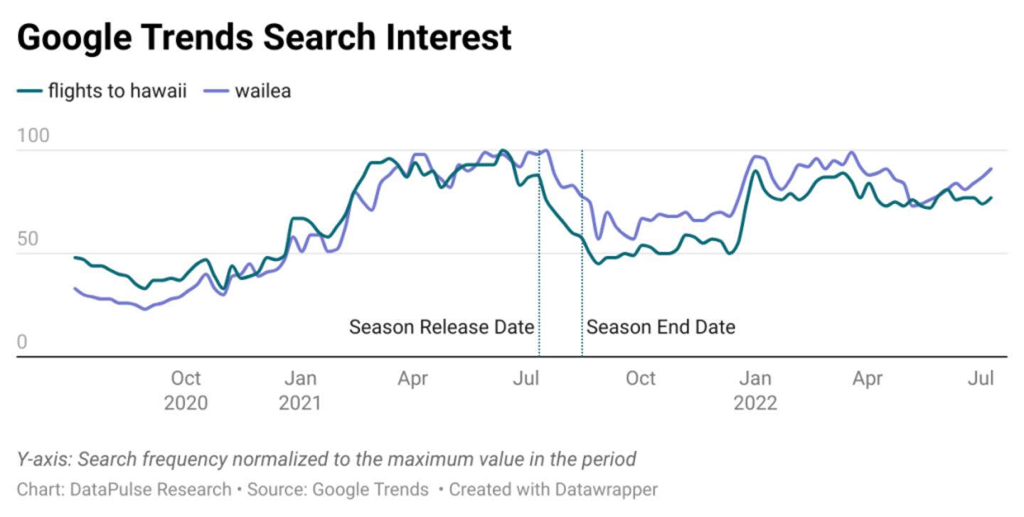 While similar ups and downs can also be seen in the previous six months, searches for “Koh Samui” (the specific Thai island where Season 3 is set) increased 170% after the season dropped.