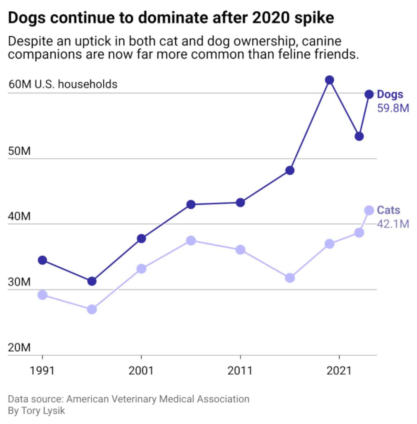 Canines are top dog when it comes to pet ownership: 45.5 million households have dogs compared to 32.1 million that have cats in 2024, according to the American Veterinary Medical Association. In a distant third are freshwater fish at 3.9 million, while birds, reptiles, and small animals trailing at 2.1 million, 2.3 million, and 1.3 million, respectively. To further explore why Americans prefer dogs to cats, Ollie used data from the AMVA to explore how pet popularity has shifted over the past three decades.