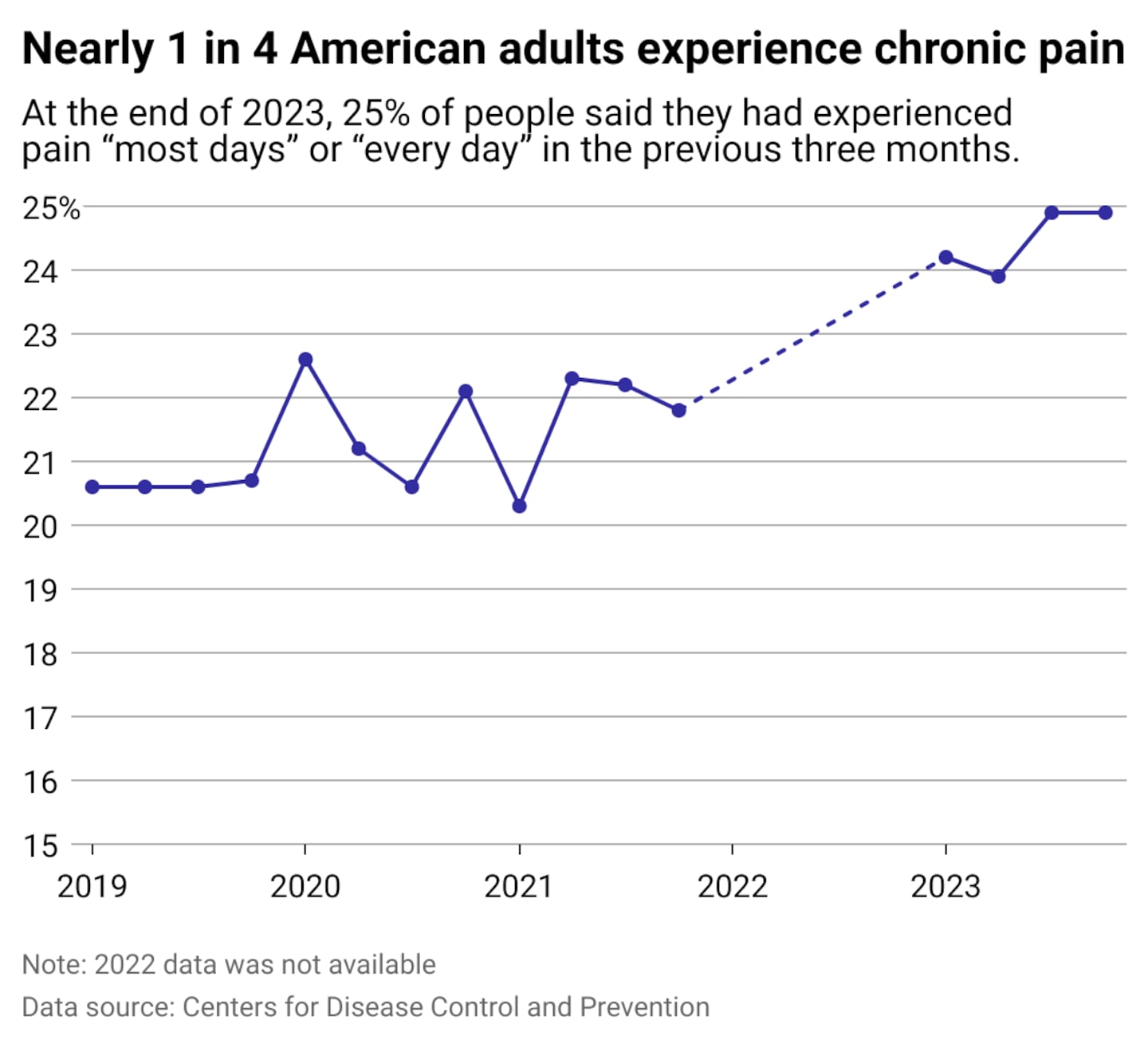 These and other symptoms of chronic pain are often associated with older adults, but chronic pain is a pervasive public health issue that is hard to measure. Nearly 1 in 4 adults said they experienced chronic pain, according to a 2023 survey by the Centers for Disease Control and Prevention. Almost 1 in 10 reported that their daily life or work had been impacted by persistent, debilitating pain in the past three months. On top of the personal toll that chronic pain takes on Americans, the financial cost to the country of health care expenses and lost productivity can exceed hundreds of billions of dollars annually.