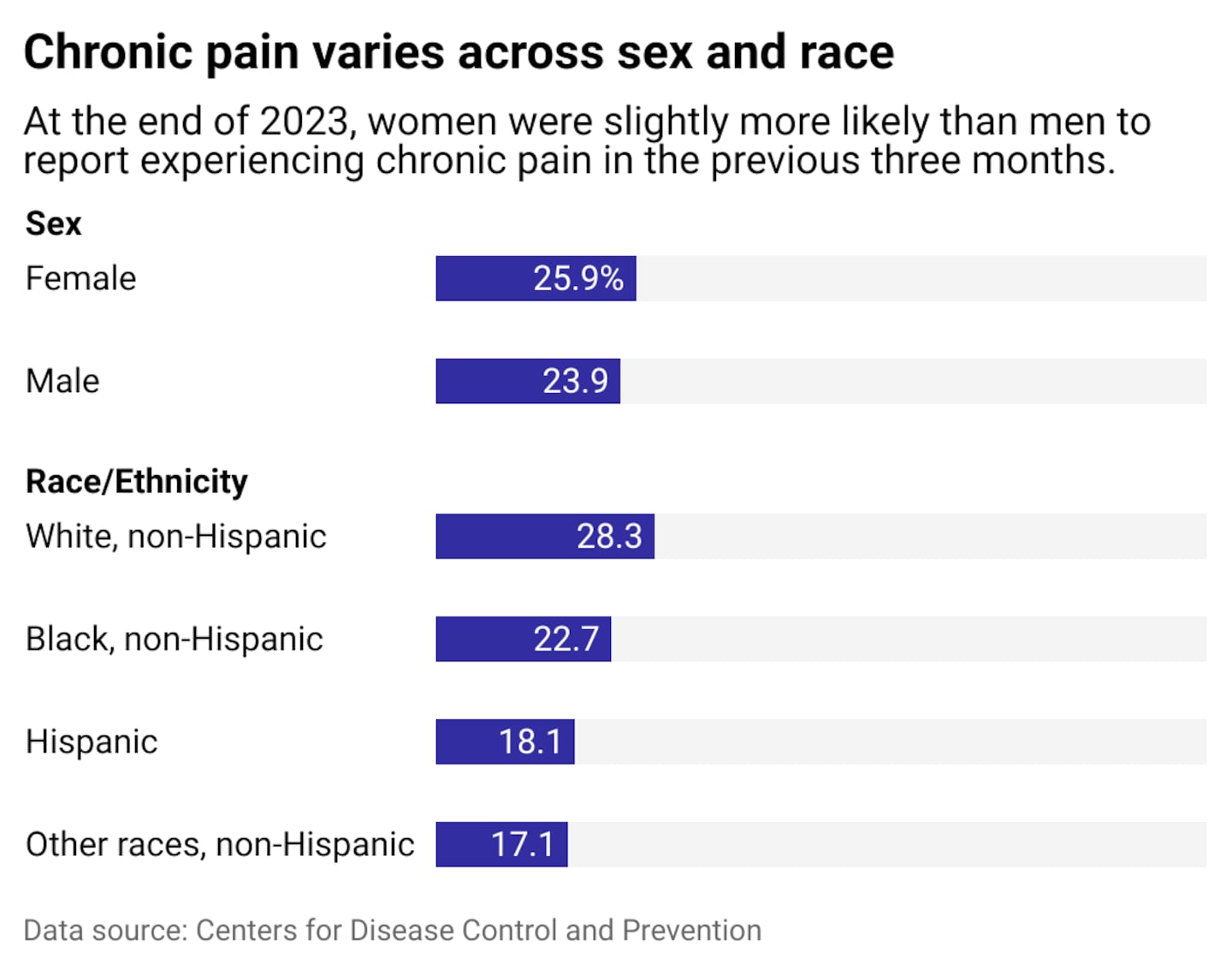 American Indian and Alaska Native people are twice as likely to report chronic pain when compared to Asian non-Hispanic and Hispanic adults, according to CDC 2023 data. When seeking help for persistent, disabling pain, Black men are less likely than white men to receive treatment or pain relief.