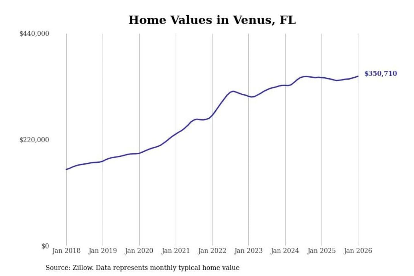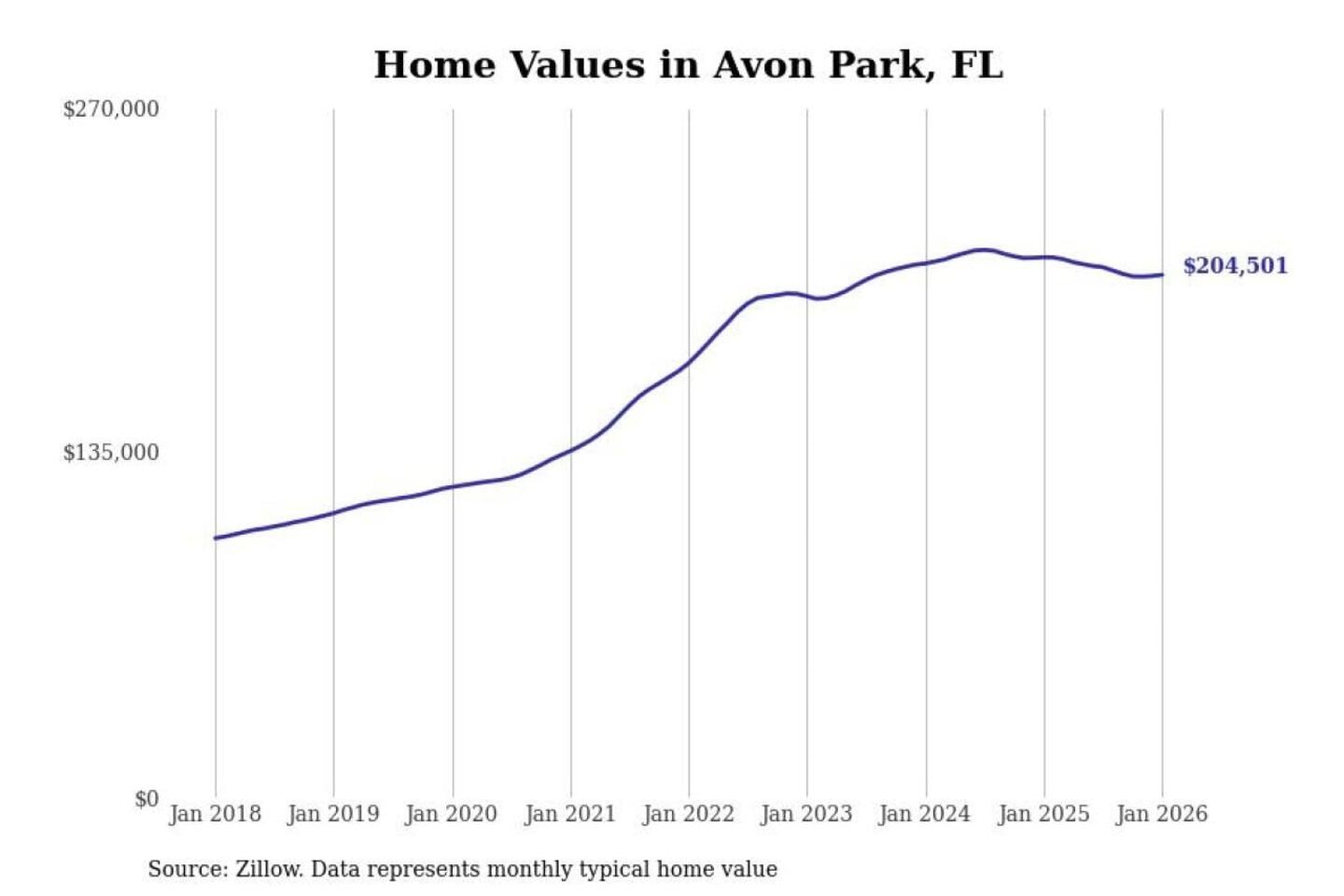 Stacker compiled a list of cities with the most expensive homes in the Sebring-Avon Park, FL metro area using data from Zillow. Charts show the monthly typical home value since January 2018.