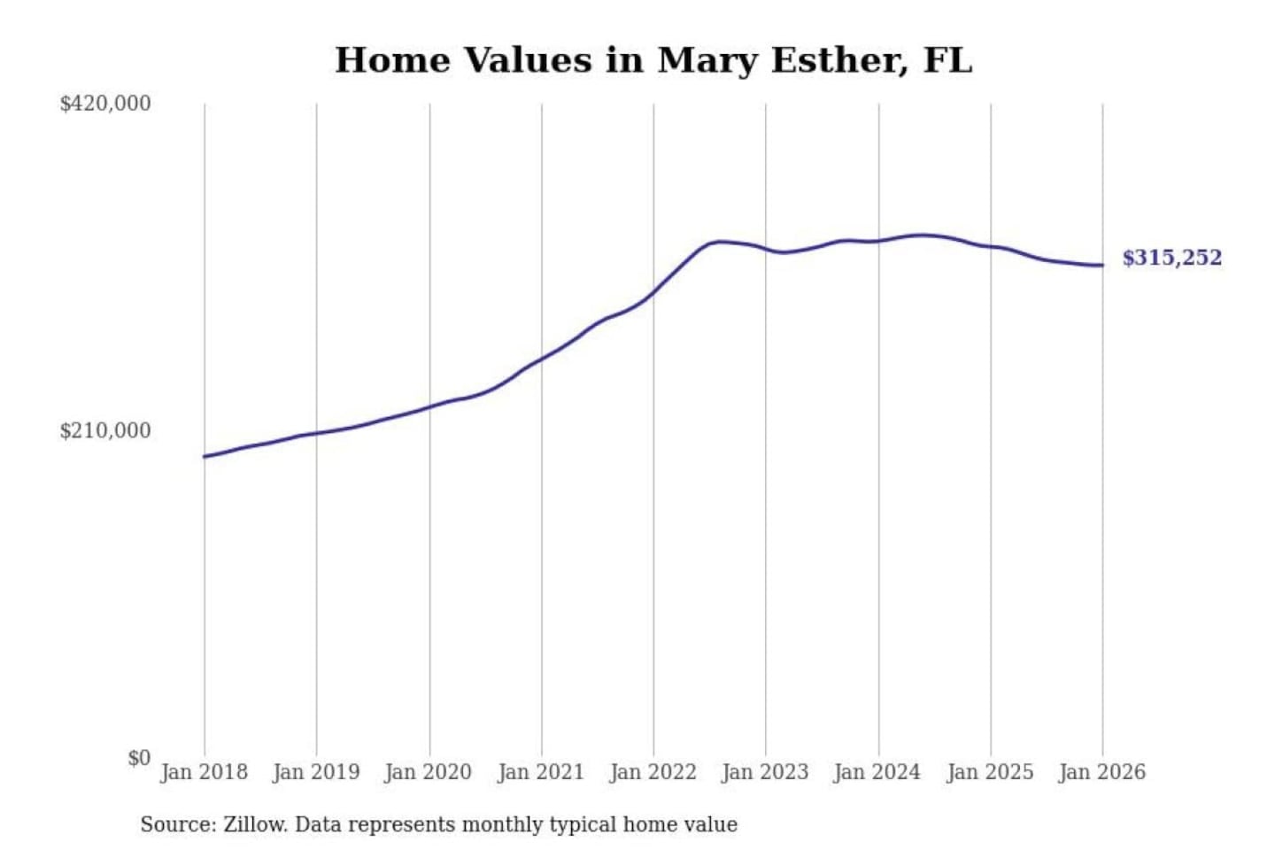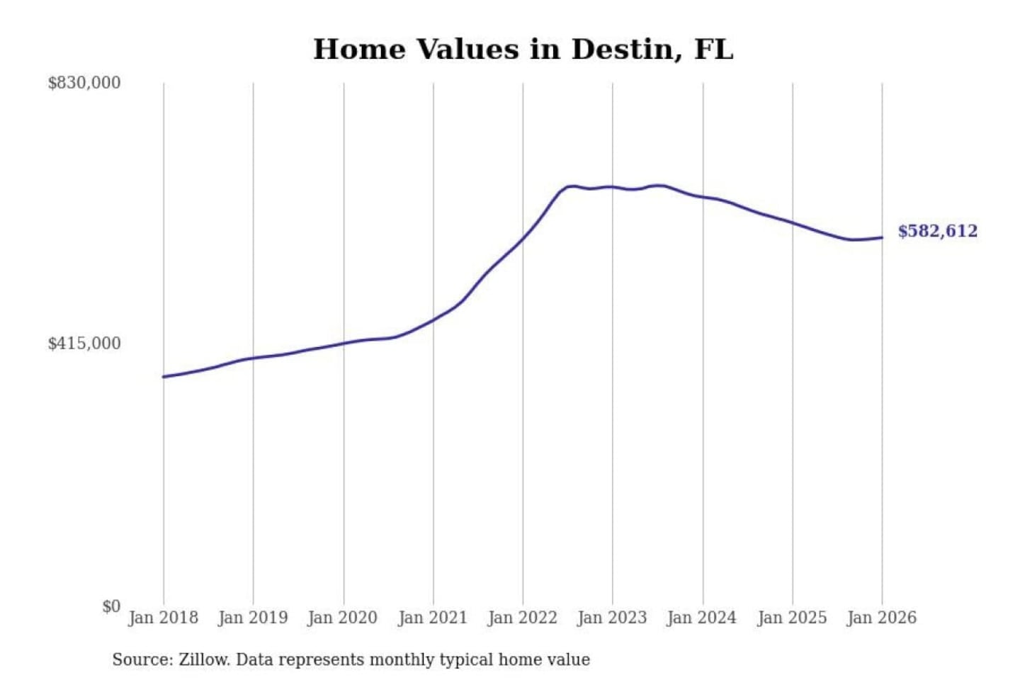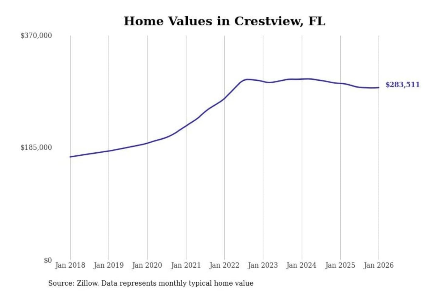 Stacker compiled a list of cities with the most expensive homes in the Crestview-Fort Walton Beach-Destin, FL metro area using data from Zillow. Charts show the monthly typical home value since January 2018.