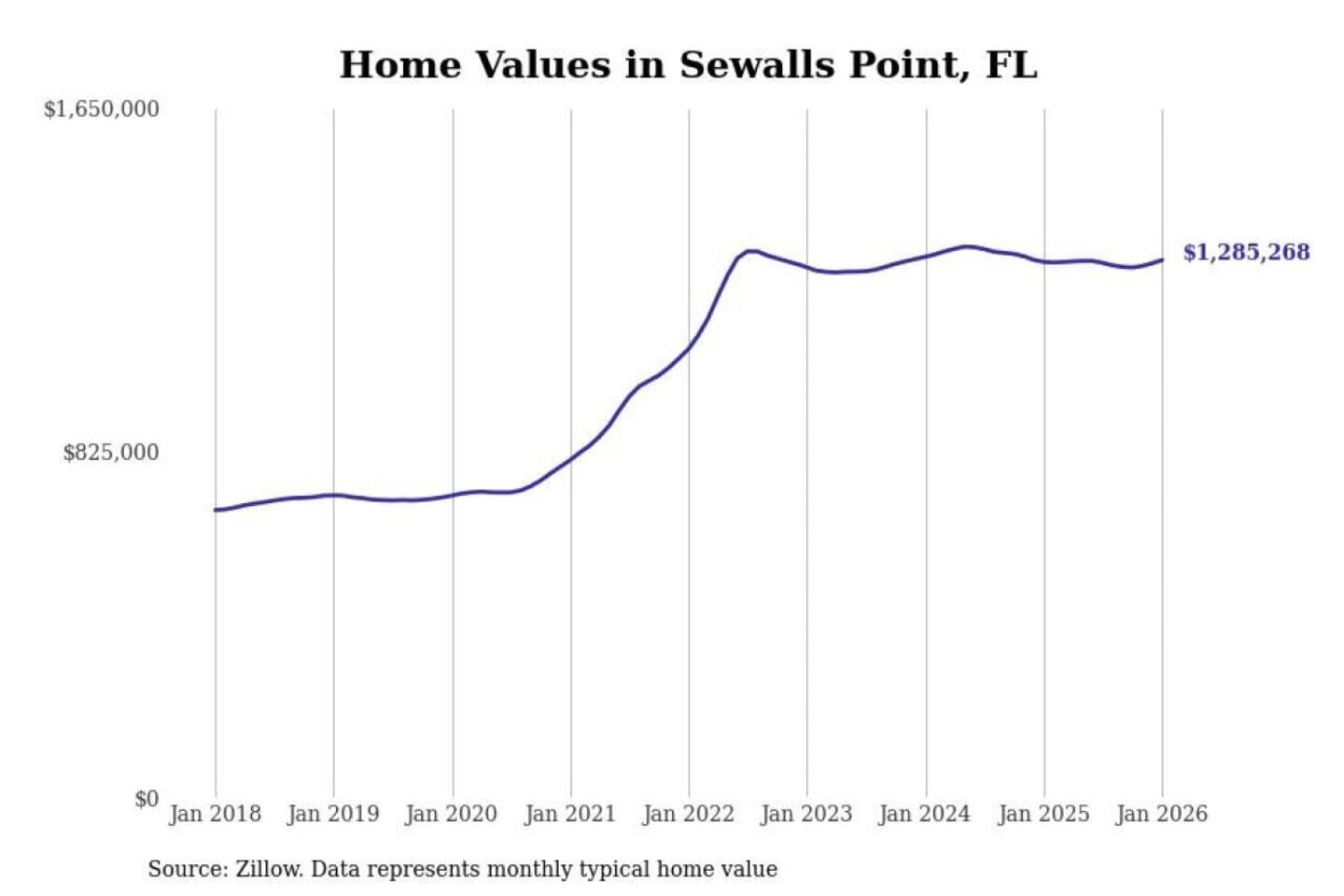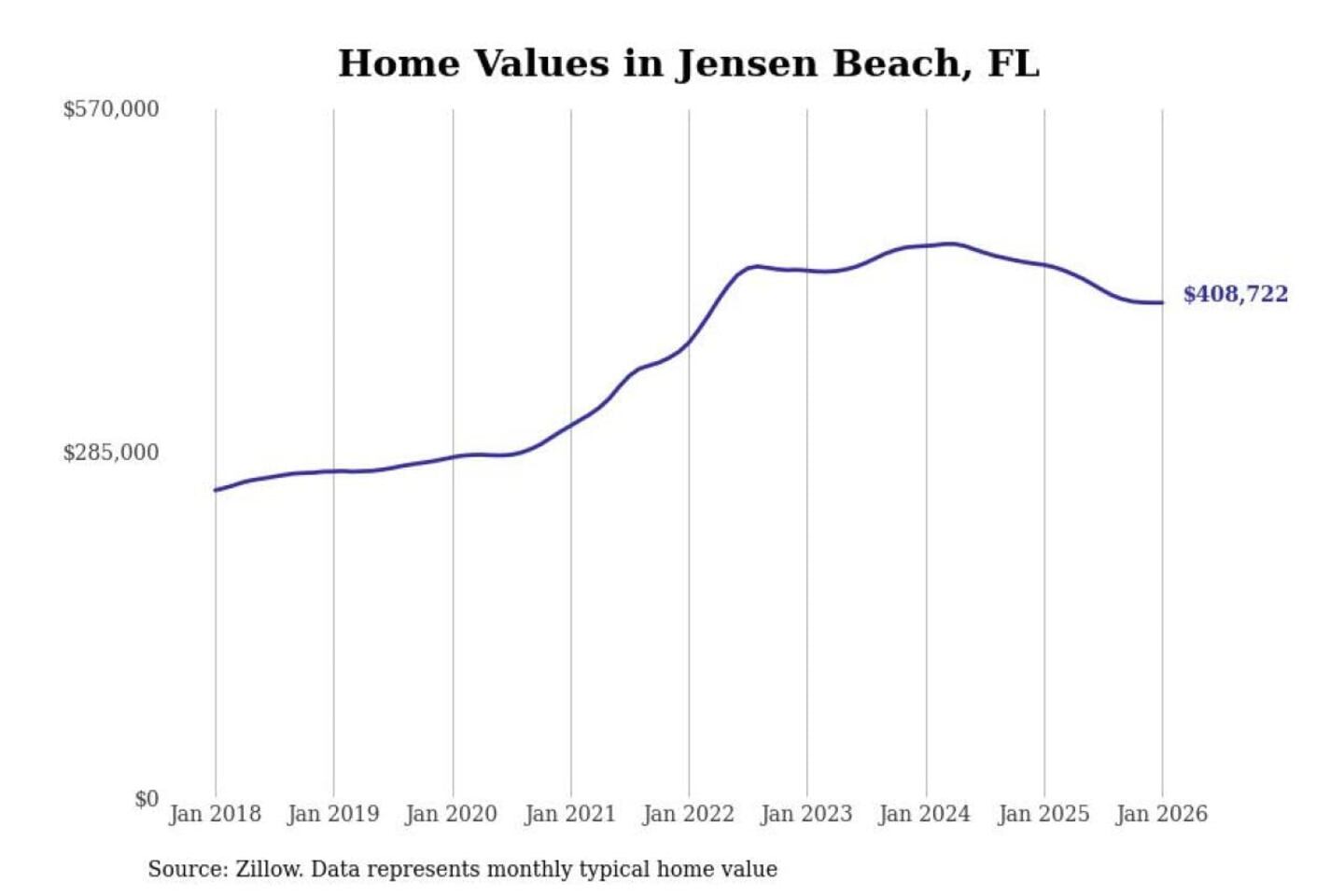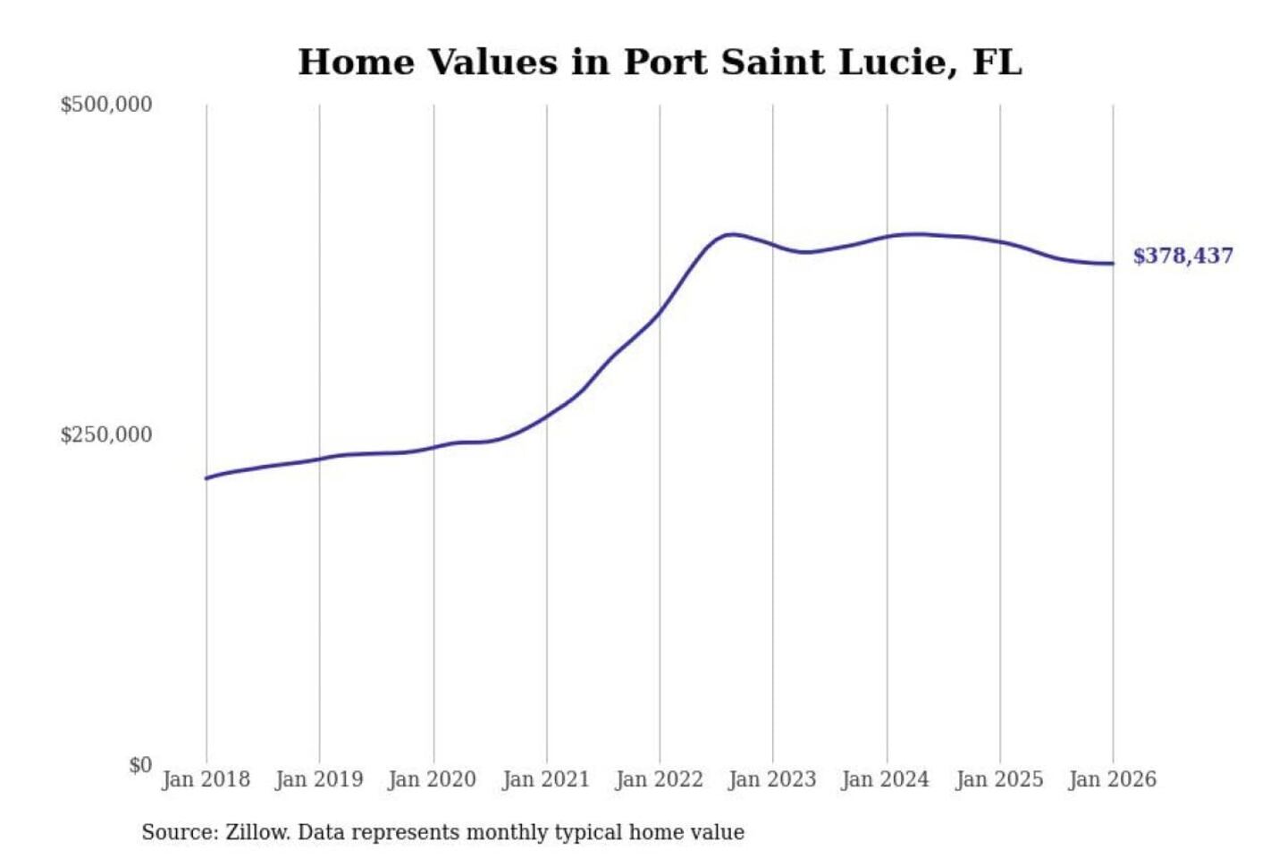 Stacker compiled a list of cities with the most expensive homes in the Port St. Lucie, FL metro area using data from Zillow. Charts show the monthly typical home value since January 2018.