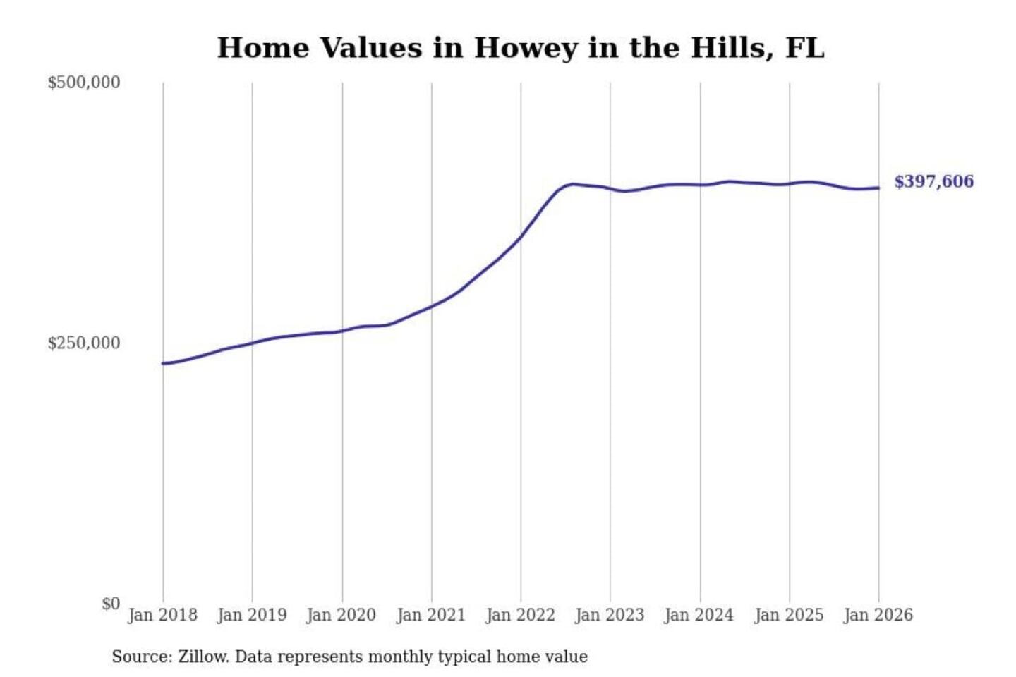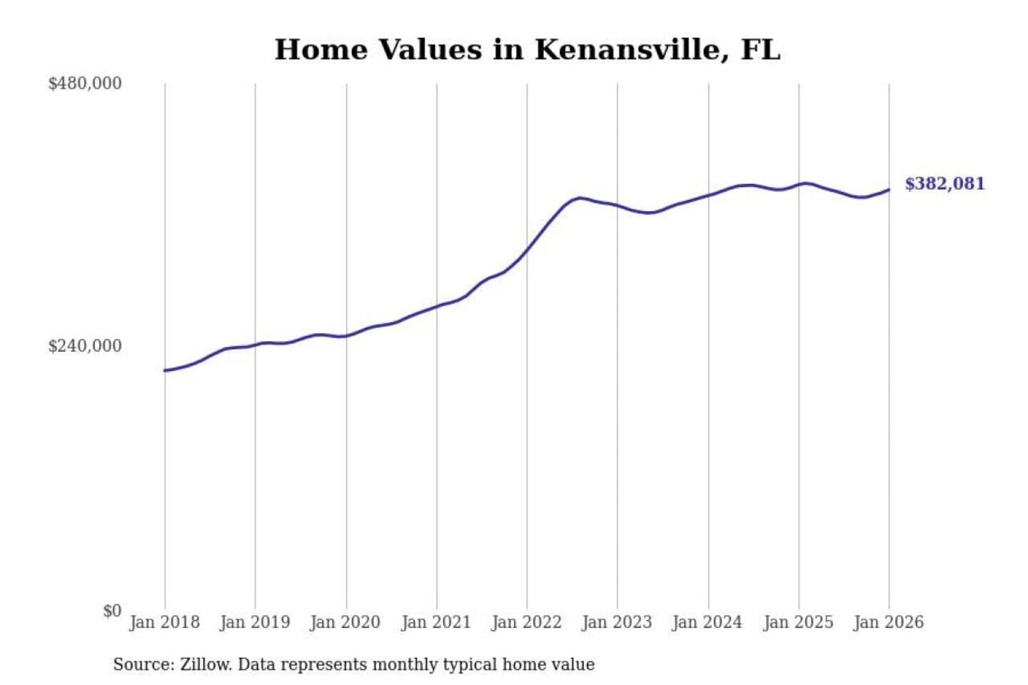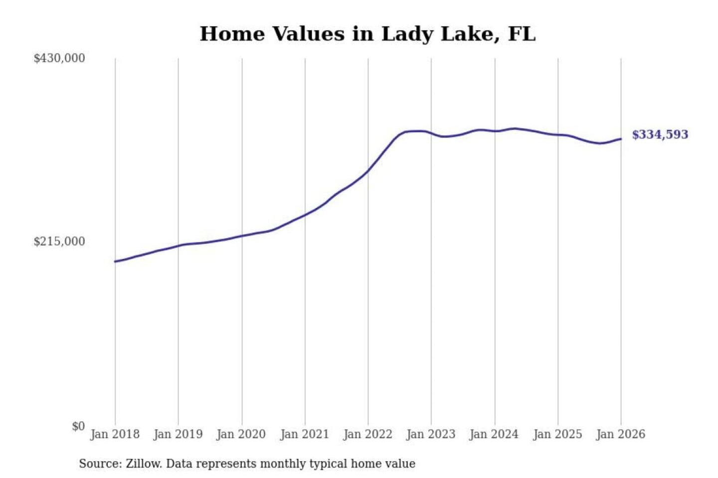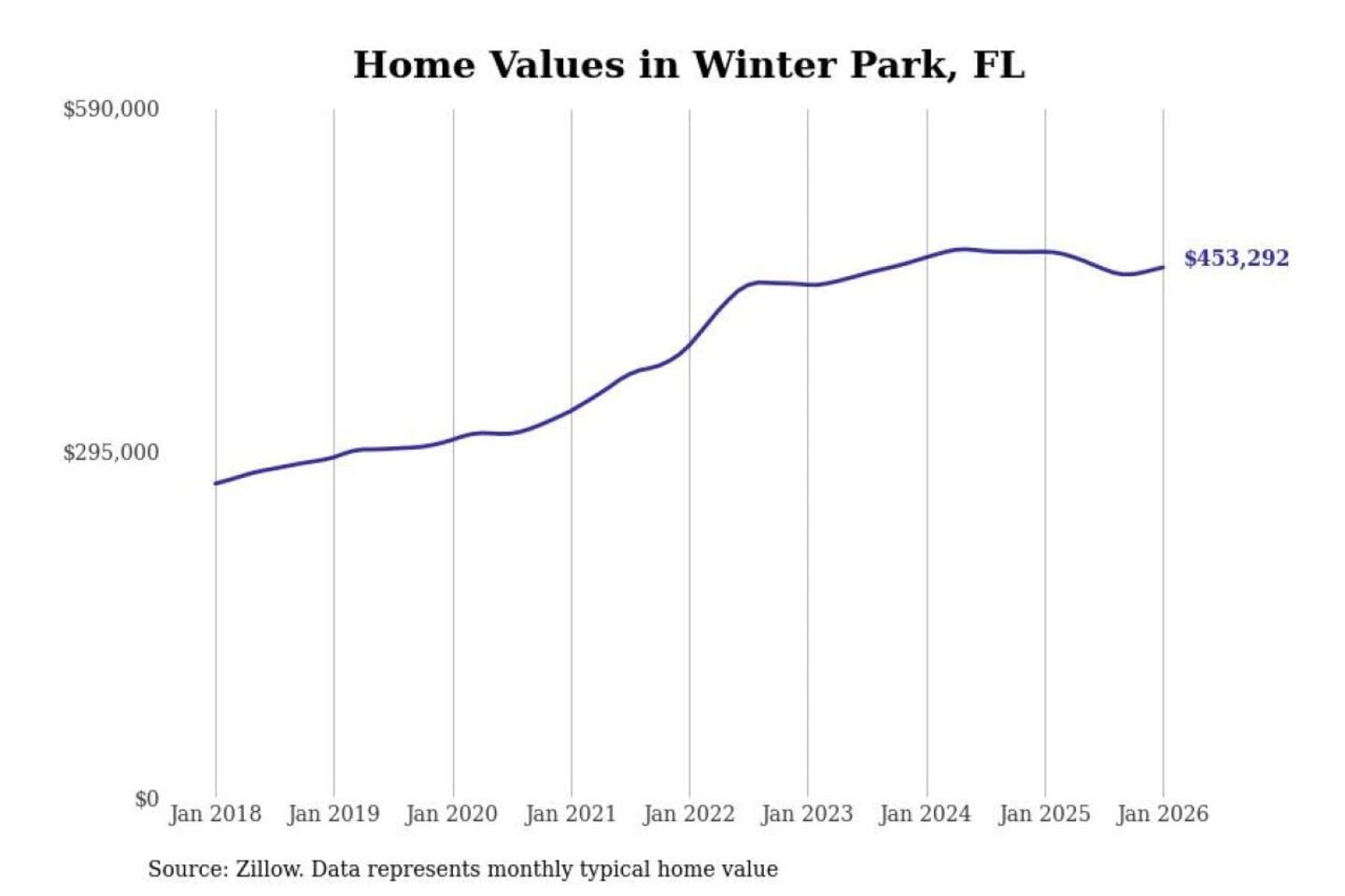 Stacker compiled a list of cities with the most expensive homes in the Orlando-Kissimmee-Sanford, FL metro area using data from Zillow. Charts show the monthly typical home value since January 2018.
