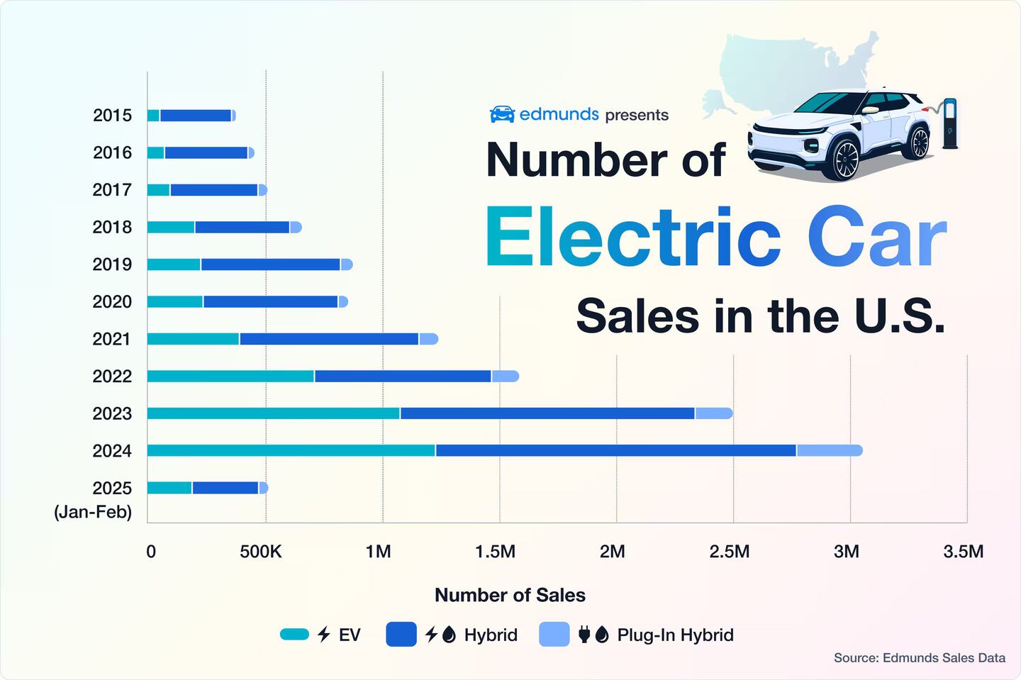 Last year was another record-breaking year for electric vehicles, with sales passing 1.2 million. EV sales could merely hold steady in 2025 because new vehicle prices are likely to increase due to tariffs on imported vehicles and parts and the possible rollback of federal EV incentives. Still, many automotive research firms expect EV sales to steadily grow into the 2030s. Below, Edmunds assesses past and current EV sales based on data it has collected. The analysis also includes hybrid and plug-in hybrid sales, as well as future EV sales projections.