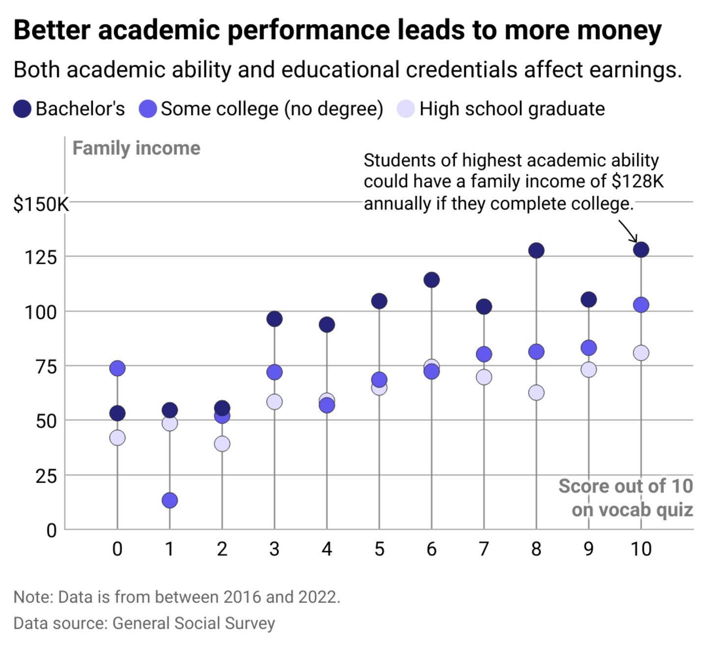 GSS data shows that both the educational credentials a person has and their academic fitness—as measured by a short vocabulary quiz—matter when it comes to earnings. For example, a person who scored a 5 out of 10 on the Wordsum quiz can be expected to have a family income of around $65,000 a year if they graduated from high school but never went to college, $69,000 if they went to college but did not graduate, and $105,000 if they earned a bachelor's degree.