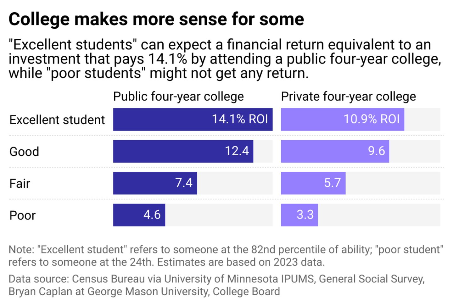 Stacker has built a statistical model that estimates how much people of different academic abilities and education levels can expect to earn and estimates the internal rates of return on pursuing a four-year degree. It considers the sum of all personal-level income, such as wages, bonuses, tips, rental income, and more. Borrowing from Bryan Caplan's aforementioned book, this analysis breaks students into four levels of academic ability, ranging from "excellent students," who have grades and test scores at roughly the 82nd percentile on tests, to "poor students," who are at roughly the 24th percentile of academic performance.