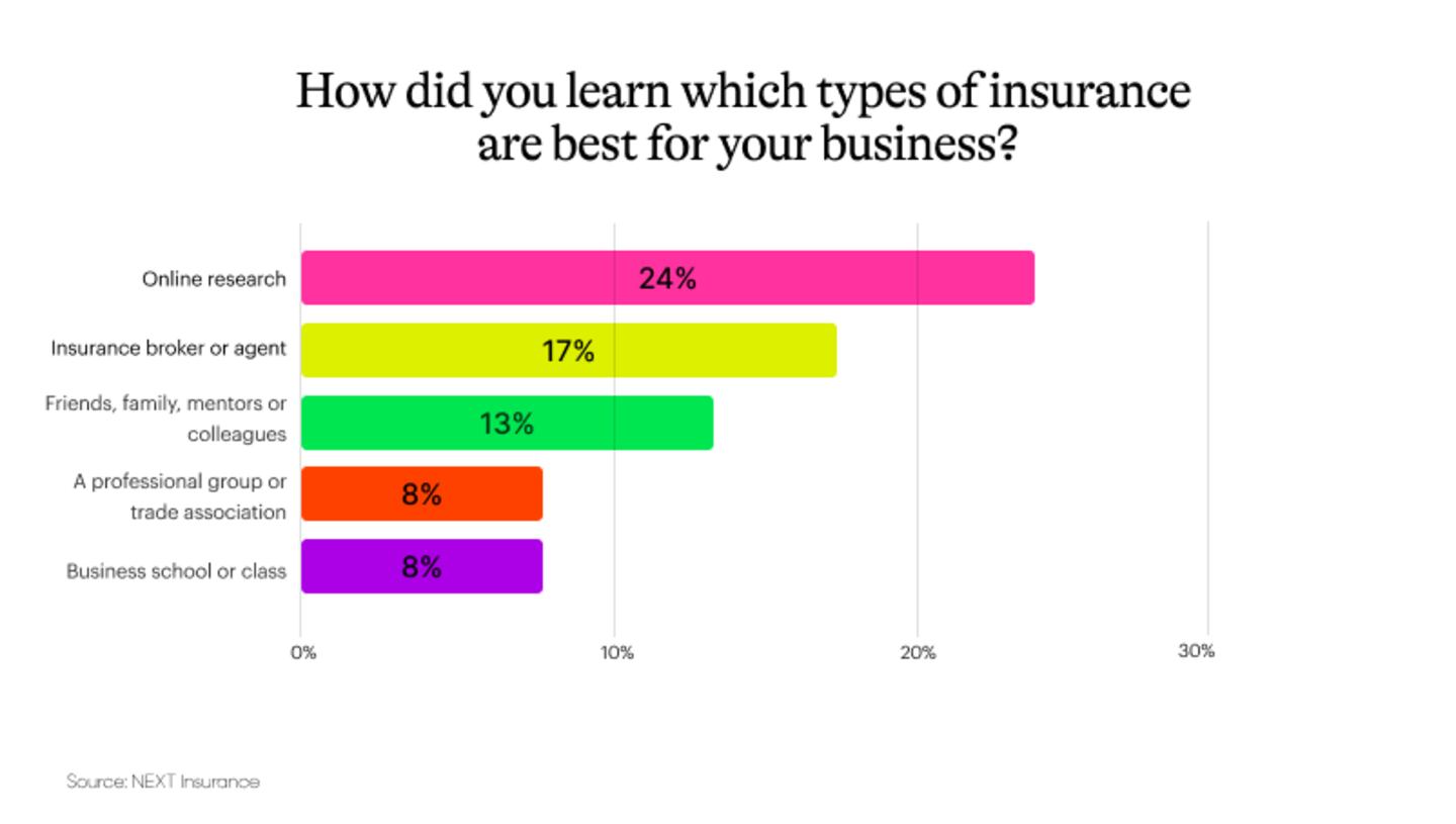 NEXT's survey revealed that 24% of participants (roughly one in four) researched online before buying coverage for their business. Just 17% relied on an insurance agent for background information on which types of insurance they require.