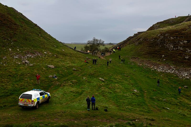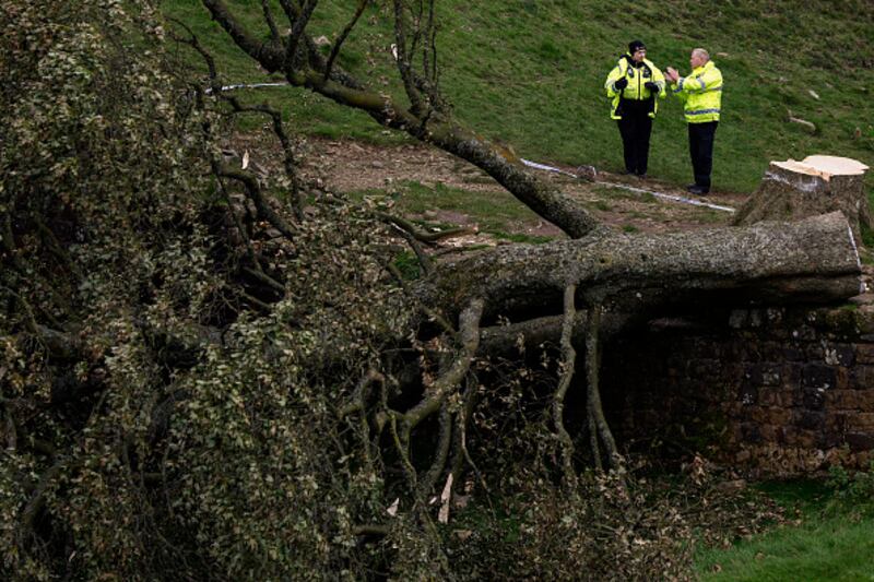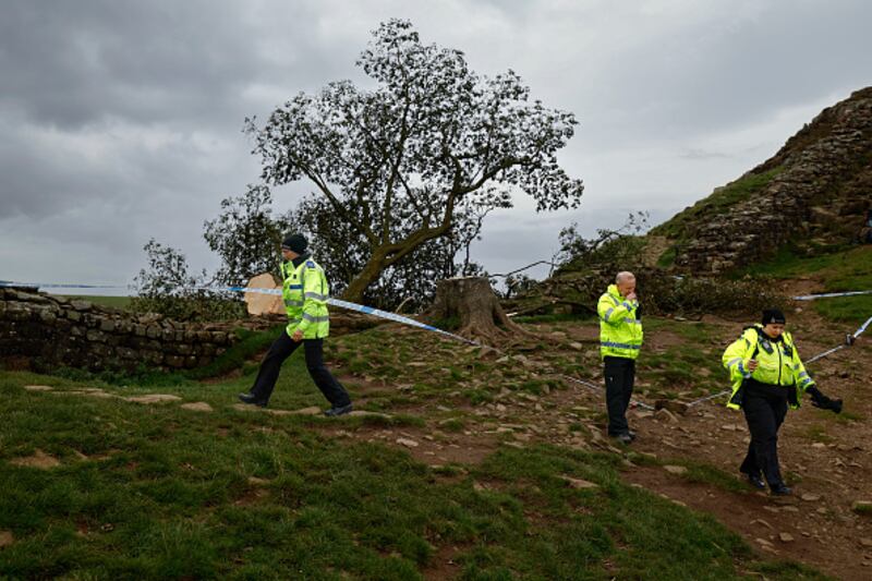 'Sycamore Gap' Tree NORTHUMBERLAND, ENGLAND - SEPTEMBER 28: Police stand beside the cordoned-off area, where the 'Sycamore Gap' tree on Hadrian's Wall now lies on the ground, leaving behind only a stump in the spot it once proudly stood on September 28, 2023 northeast of Haltwhistle, England. The tree, which was apparently felled overnight, was one of the UK's most photographed and appeared in the 1991 Kevin Costner film "Robin Hood: Prince Of Thieves." (Photo by Jeff J Mitchell/Getty Images) (Jeff J Mitchell/Getty Images)