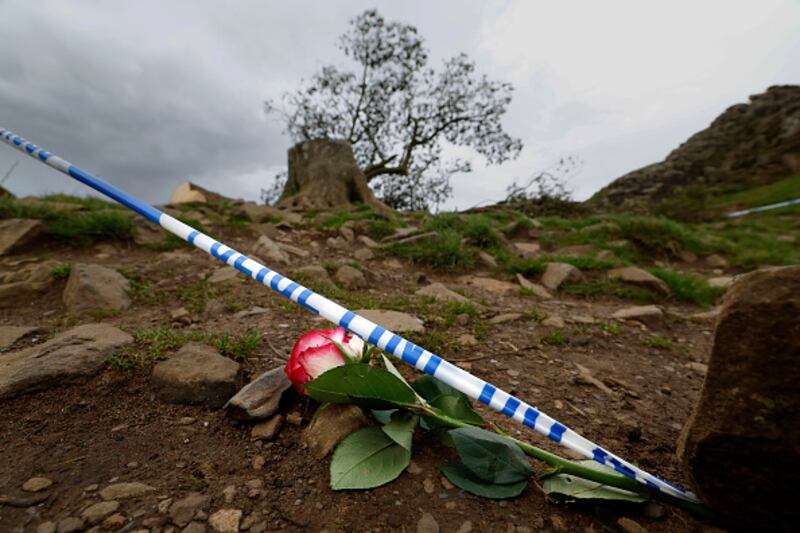 'Sycamore Gap' Tree NORTHUMBERLAND, ENGLAND - SEPTEMBER 28: 'Sycamore Gap' tree on Hadrian's Wall now lies on the ground leaving behind only a stump in the spot it once proudly stood, on September 28, 2023 northeast of Haltwhistle, England. The tree, which was apparently felled overnight, was one of the UK's most photographed and appeared in the 1991 Kevin Costner film "Robin Hood: Prince Of Thieves." (Photo by Jeff J Mitchell/Getty Images) (Jeff J Mitchell/Getty Images)