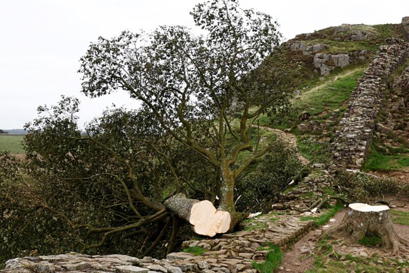 'Sycamore Gap' Tree NORTHUMBERLAND, ENGLAND - SEPTEMBER 28: 'Sycamore Gap' tree on Hadrian's Wall now lies on the ground, leaving behind only a stump in the spot it once proudly stood on September 28, 2023 northeast of Haltwhistle, England. The tree, which was apparently felled overnight, was one of the UK's most photographed and appeared in the 1991 Kevin Costner film "Robin Hood: Prince Of Thieves." (Photo by Jeff J Mitchell/Getty Images) (Jeff J Mitchell/Getty Images)