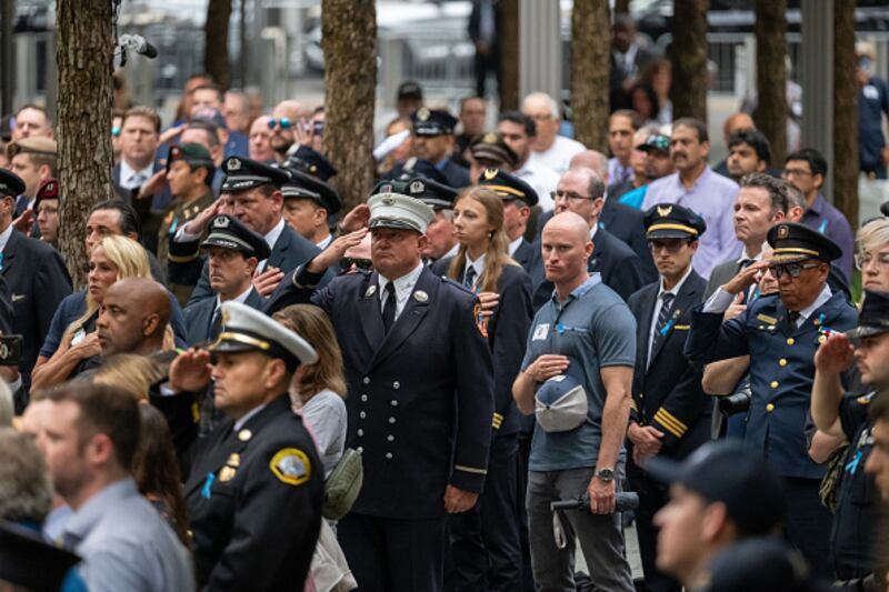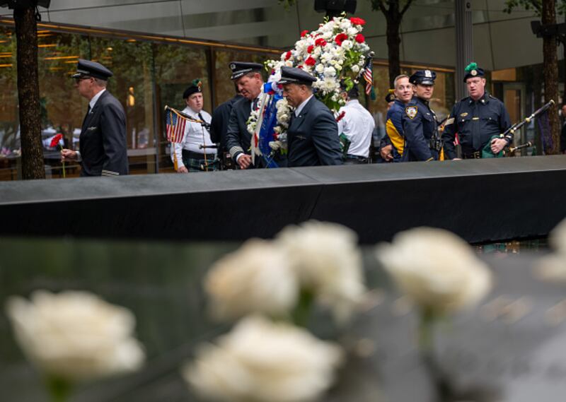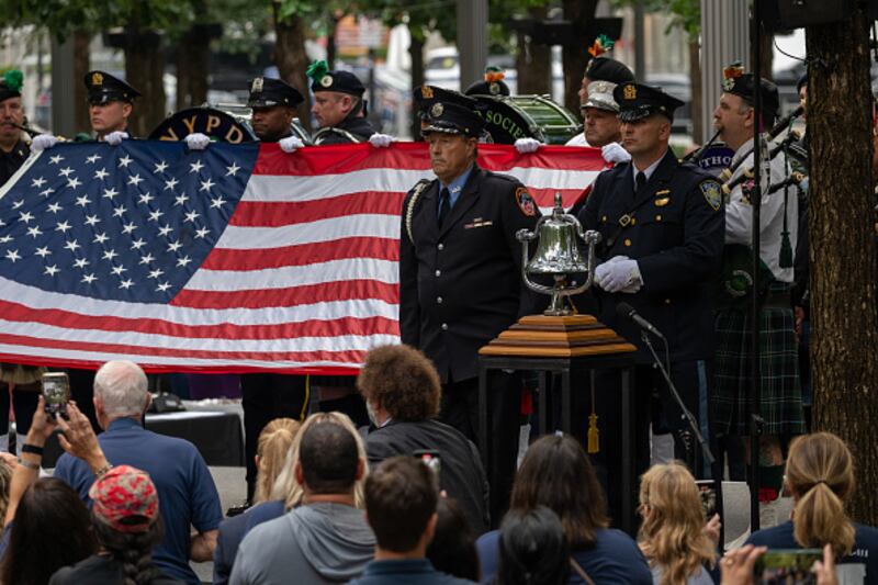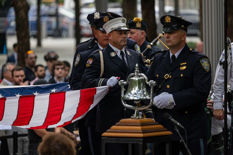 9/11 anniversary NEW YORK, NEW YORK - SEPTEMBER 11: Firefighters and members of the police take part in the ceremony at the 9/11 Memorial and Museum at the Ground Zero site in lower Manhattan during commemoration ceremonies for the 22nd anniversary of the attacks on September 11, 2023 in New York City. Monday marks the 22nd anniversary of the September 11 terrorist attacks on the World Trade Center and the Pentagon, as well as the crash of United Airlines Flight 93. In total, the attacks killed nearly 3,000 people and commenced a global war on terror which included American led conflicts in both Iraq and Afghanistan. (Photo by Spencer Platt/Getty Images) (Spencer Platt/Getty Images)