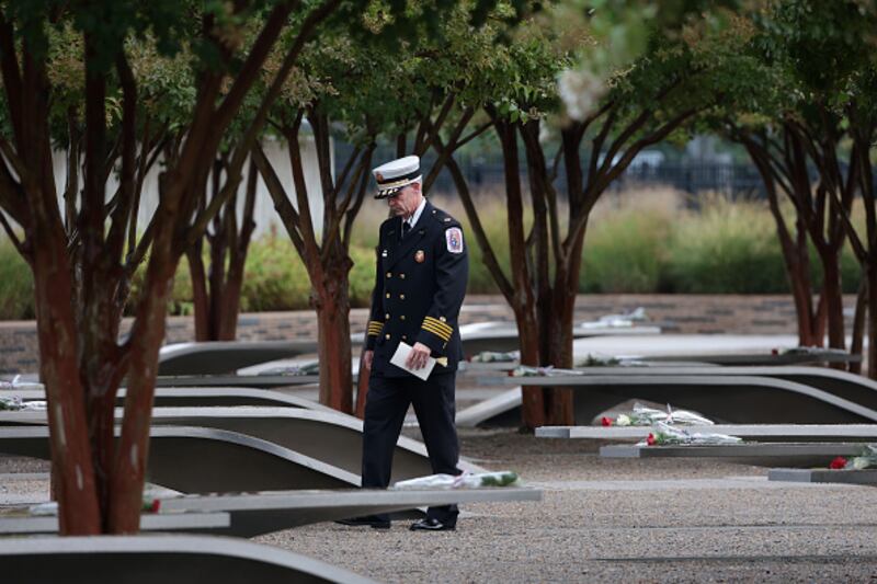 9/11 anniversary ARLINGTON, VIRGINIA - SEPTEMBER 11: A man wearing a firefighter's uniform visits the National 9/11 Pentagon Memorial during a ceremony observing the 9/11 terrorist attacks at the Pentagon on September 11, 2023 in Arlington, Virginia. The Defense Department held a remembrance ceremony for the 184 lives lost in the 2001 terrorist attack on the Pentagon. Today marks the 22nd anniversary of September 11, 2001 terrorist attacks at the World Trade Center, the Pentagon and Shanksville, Pennsylvania. (Photo by Win McNamee/Getty Images) (Win McNamee/Getty Images)