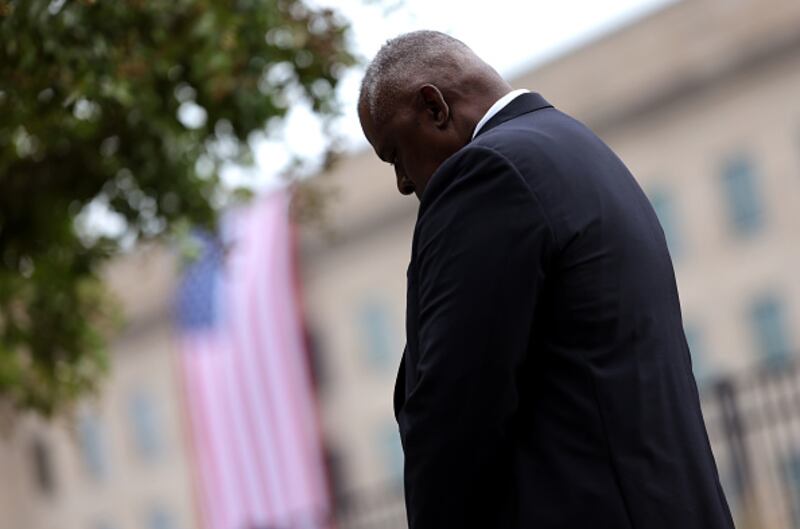 9/11 anniversary ARLINGTON, VIRGINIA - SEPTEMBER 11: U.S. Secretary of Defense Lloyd Austin participates in a wreath laying ceremony during a ceremony observing the 9/11 terrorist attacks at the Pentagon on September 11, 2023 in Arlington, Virginia. The Defense Department held a remembrance ceremony for the 184 lives lost in the 2001 terrorist attack on the Pentagon. Today marks the 22nd anniversary of September 11, 2001 terrorist attacks at the World Trade Center, the Pentagon and Shanksville, Pennsylvania. (Photo by Win McNamee/Getty Images) (Win McNamee/Getty Images)
