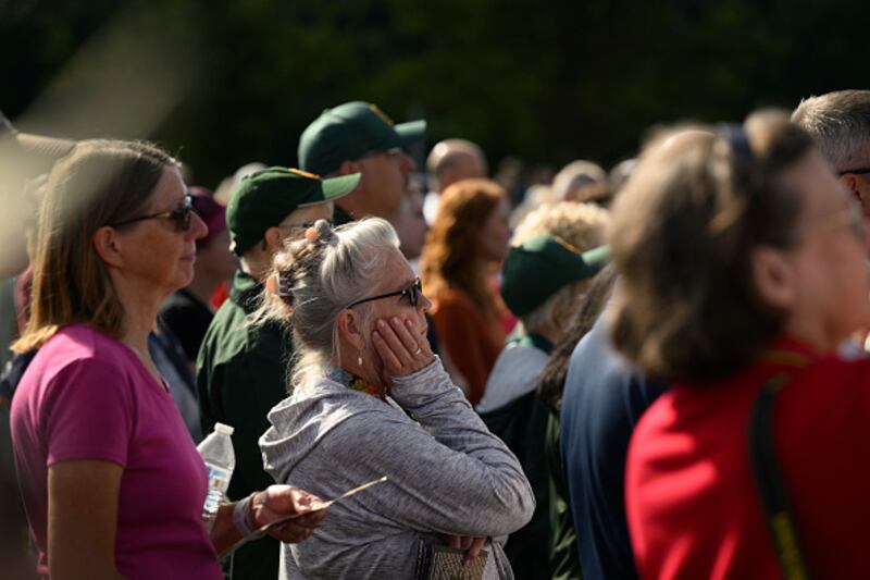9/11 anniversary SHANKSVILLE, PENNSYLVANIA - SEPTEMBER 11: Visitors listen to the roll call of names of the victims during a ceremony commemorating the 22nd anniversary of the crash of Flight 93 during the September 11, 2001 terrorist attacks at the Flight 93 National Memorial on September 11, 2023 in Shanksville, Pennsylvania. The nation is marking the 22nd anniversary of the September 11 attacks, when the terrorist group al-Qaeda flew hijacked airplanes into the World Trade Center, Shanksville, PA and the Pentagon, killing nearly 3,000 people. (Photo by Jeff Swensen/Getty Images) (Jeff Swensen/Getty Images)