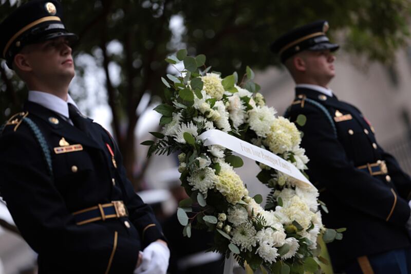 9/11 anniversary ARLINGTON, VIRGINIA - SEPTEMBER 11: A detail of a wreath as U.S. Secretary of Defense Lloyd Austin (not pictured) participates in a wreath laying ceremony during a ceremony observing the 9/11 terrorist attacks at the Pentagon on September 11, 2023 in Arlington, Virginia. The Defense Department held a remembrance ceremony for the 184 lives lost in the 2001 terrorist attack on the Pentagon. Today marks the 22nd anniversary of September 11, 2001 terrorist attacks at the World Trade Center, the Pentagon and Shanksville, Pennsylvania. (Photo by Win McNamee/Getty Images) (Win McNamee/Getty Images)