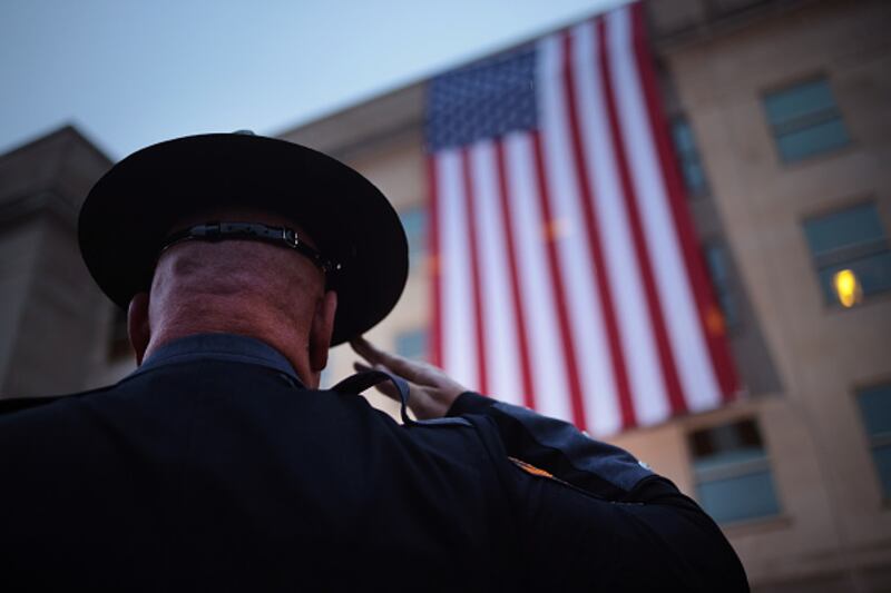 22nd anniversary of 9/11 ARLINGTON, VIRGINIA - SEPTEMBER 11: A first responders watches as an American flag is unfurled during a ceremony observing the 9/11 terrorist attacks at the Pentagon on September 11, 2023 in Arlington, Virginia. The Defense Department held a remembrance ceremony for the 184 lives lost in the 2001 terrorist attack on the Pentagon. Today marks the 22nd anniversary of September 11, 2001 terrorist attacks at the World Trade Center, the Pentagon and Shanksville, Pennsylvania. (Photo by Win McNamee/Getty Images) (Win McNamee/Getty Images)