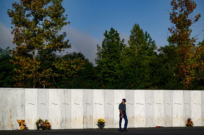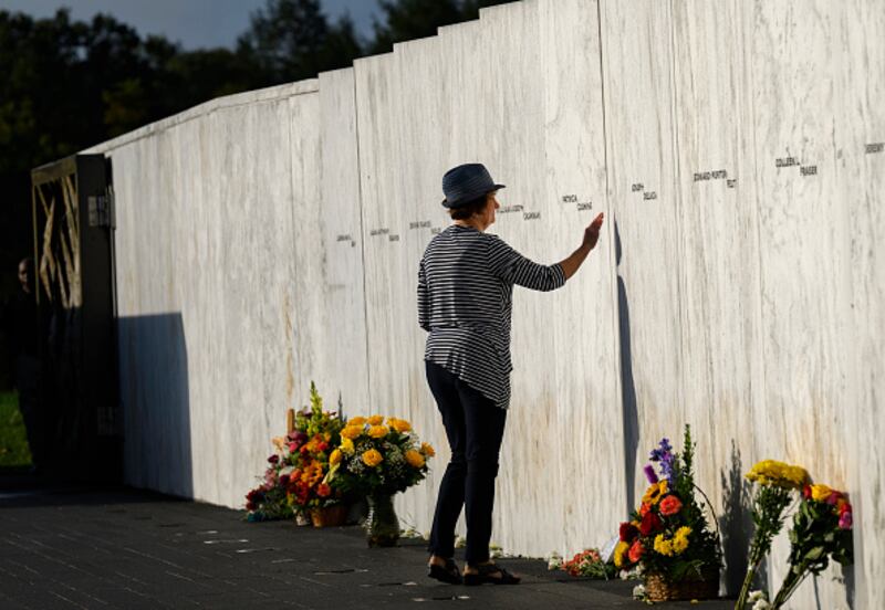 9/11 anniversary SHANKSVILLE, PENNSYLVANIA - SEPTEMBER 11: A relative of one of the victims pays his respects at the Wall of Names before a ceremony commemorating the 22nd anniversary of the crash of Flight 93 during the September 11, 2001 terrorist attacks at the Flight 93 National Memorial on September 11, 2023 in Shanksville, Pennsylvania. The nation is marking the 22nd anniversary of the September 11 attacks, when the terrorist group al-Qaeda flew hijacked airplanes into the World Trade Center, Shanksville, PA and the Pentagon, killing nearly 3,000 people. (Photo by Jeff Swensen/Getty Images) (Jeff Swensen/Getty Images)