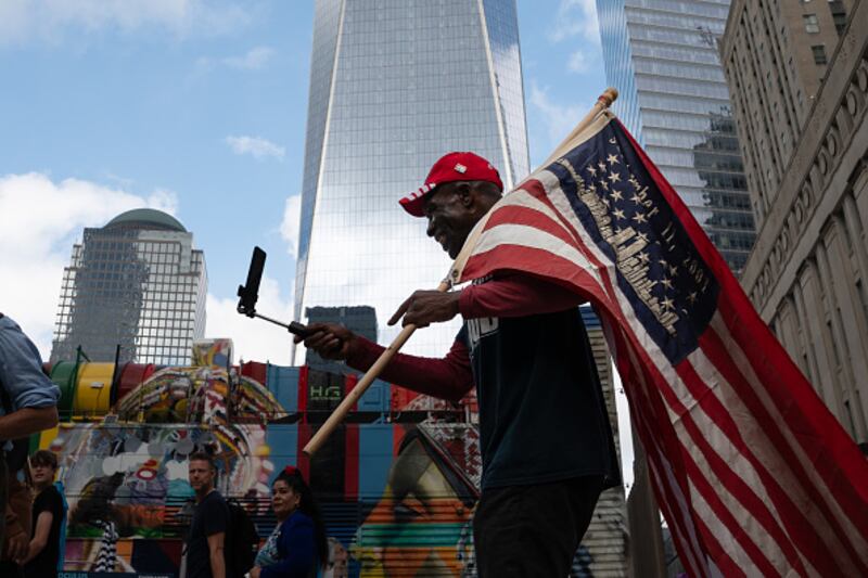 9/11 anniversary NEW YORK, NEW YORK - SEPTEMBER 11: A person walks near Ground Zero with a Remember 9/11 flag on September 11, 2023 in New York City. Family and friends honored the lives of their lost loved ones on the 22nd anniversary of the terror attacks of September 11, 2001, at the World Trade Center, Shanksville, PA and the Pentagon, that killed nearly 3,000 people. (Photo by David Dee Delgado/Getty Images) (David Dee Delgado/Getty Images)