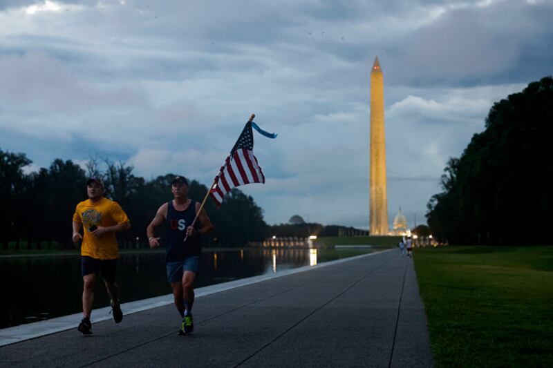 9/11 anniversary WASHINGTON, DC - SEPTEMBER 11: A jogger carries the American flag as they run along the National Mall on September 11, 2023 in Washington, DC. U.S. Leaders are observing the 22nd anniversary of the 9/11 terrorist attacks around the country with first lady Jill Biden attending a ceremony at the National 9/11 Pentagon Memorial and U.S. President Joe Biden speaking to service members in Alaska. (Photo by Anna Moneymaker/Getty Images) (Anna Moneymaker/Getty Images)
