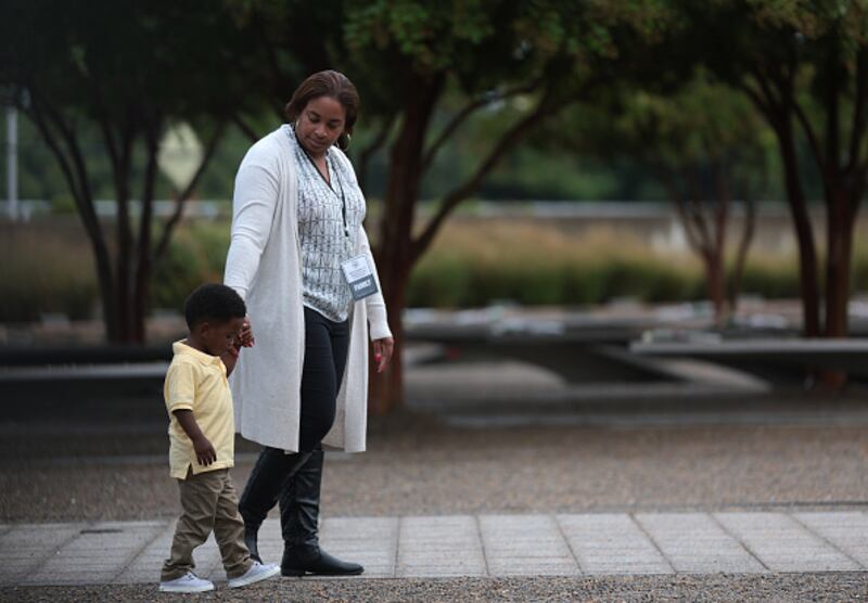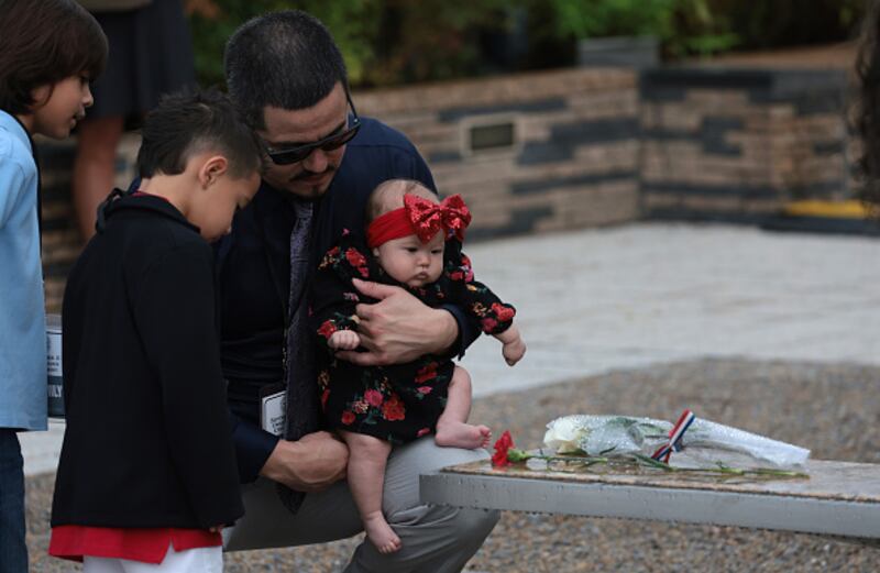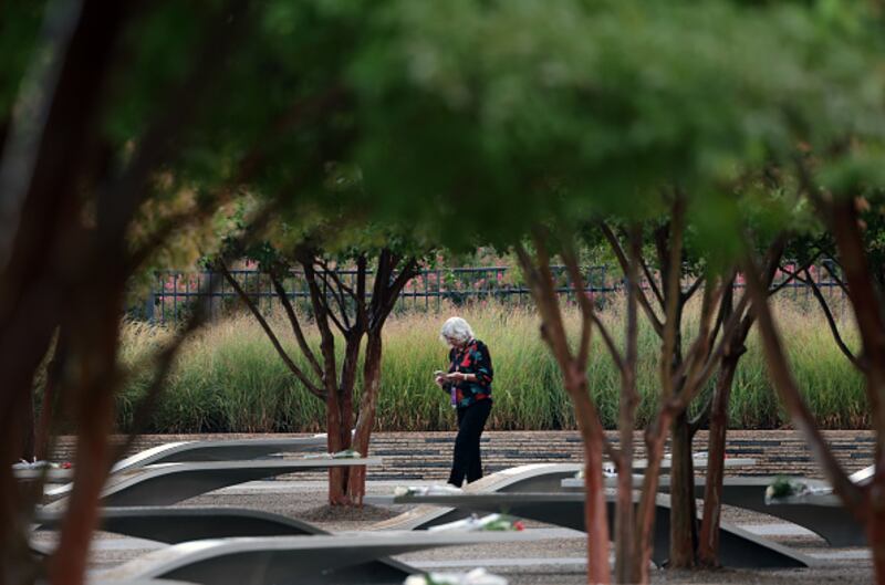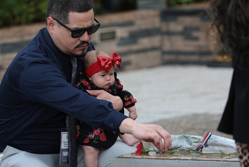 9/11 anniversary ARLINGTON, VIRGINIA - SEPTEMBER 11: Family members of victims visit the National 9/11 Pentagon Memorial during a ceremony observing the 9/11 terrorist attacks at the Pentagon on September 11, 2023 in Arlington, Virginia. The Defense Department held a remembrance ceremony for the 184 lives lost in the 2001 terrorist attack on the Pentagon. Today marks the 22nd anniversary of September 11, 2001 terrorist attacks at the World Trade Center, the Pentagon and Shanksville, Pennsylvania. (Photo by Win McNamee/Getty Images) (Win McNamee/Getty Images)