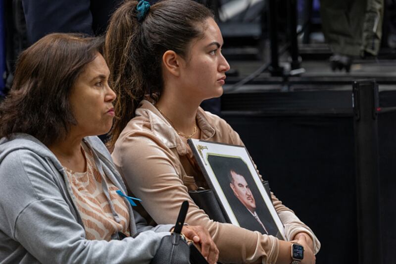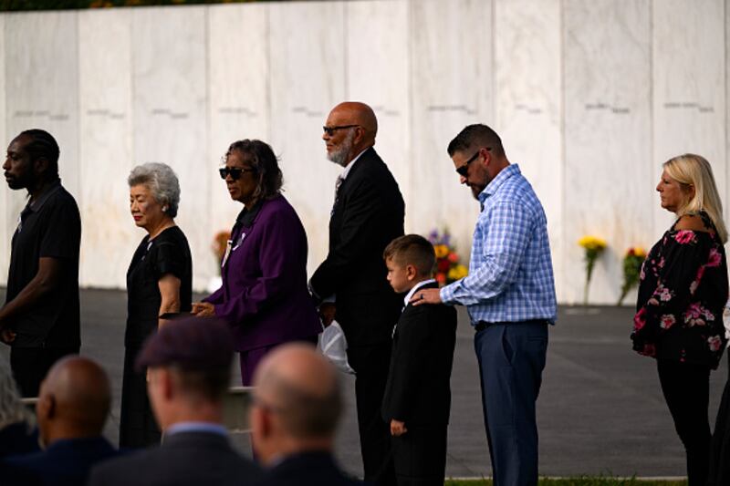 9/11 Anniversary ARLINGTON, VIRGINIA - SEPTEMBER 11: Family members of victims attend a ceremony observing the 9/11 terrorist attacks at the Pentagon on September 11, 2023 in Arlington, Virginia. The Defense Department held a remembrance ceremony for the 184 lives lost in the 2001 terrorist attack on the Pentagon. Today marks the 22nd anniversary of September 11, 2001 terrorist attacks at the World Trade Center, the Pentagon and Shanksville, Pennsylvania. (Photo by Win McNamee/Getty Images) (Win McNamee/Getty Images)