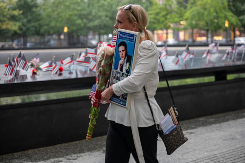 9/11 Anniversary NEW YORK, NEW YORK - SEPTEMBER 11: Diane walks with a picture of her former husband Michael Massaroli as eople visit the 9/11 Memorial at the Ground Zero site in lower Manhattan as the nation commemorates the 22nd anniversary of the attacks on September 11, 2023 in New York City. Monday marks the 22nd anniversary of the September 11 terrorist attacks on the World Trade Center and the Pentagon, as well as the crash of United Airlines Flight 93. In total, the attacks killed nearly 3,000 people and commenced a global war on terror which included American led conflicts in both Iraq and Afghanistan. (Photo by Spencer Platt/Getty Images) (Spencer Platt/Getty Images)