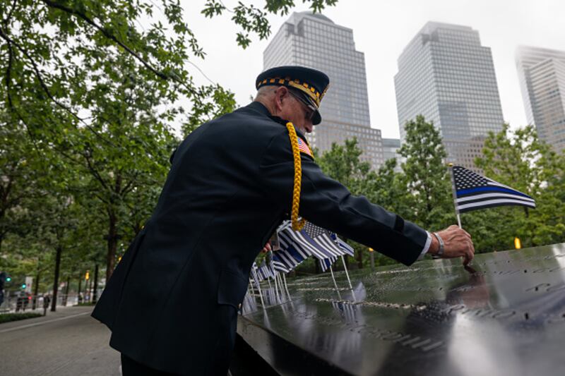 9/11 Anniversary NEW YORK, NEW YORK - SEPTEMBER 11: Retired police officer Sam Pulia places flags on the names along the 9/11 Memorial at the Ground Zero site in lower Manhattan as the nation commemorates the 22nd anniversary of the attacks on September 11, 2023 in New York City. Monday marks the 22nd anniversary of the September 11 terrorist attacks on the World Trade Center and the Pentagon, as well as the crash of United Airlines Flight 93. In total, the attacks killed nearly 3,000 people and commenced a global war on terror which included American led conflicts in both Iraq and Afghanistan. (Photo by Spencer Platt/Getty Images) (Spencer Platt/Getty Images)