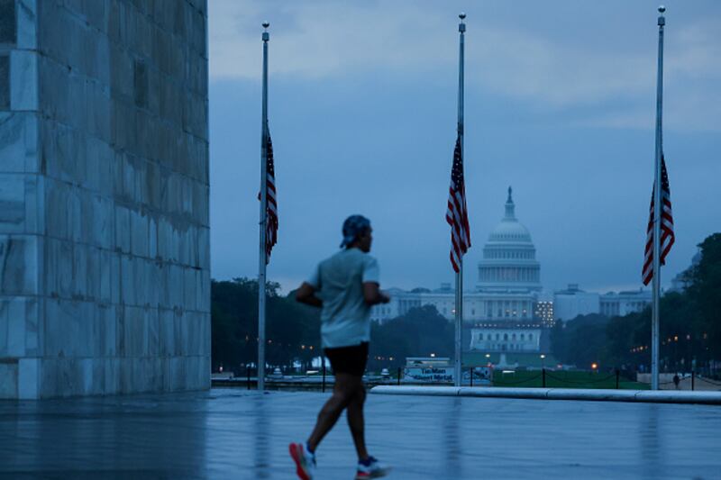 9/11 anniversary WASHINGTON, DC - SEPTEMBER 11: A jogger runs past American flags flying at half staff around the Washington Monument on the National Mall on September 11, 2023 in Washington, DC. U.S. Leaders are observing the 22nd anniversary of the terror attacks around the country with first lady Jill Biden attending a ceremony at the National 9/11 Pentagon Memorial and U.S. President Joe Biden speaking to service members in Alaska. (Photo by Anna Moneymaker/Getty Images) (Anna Moneymaker/Getty Images)