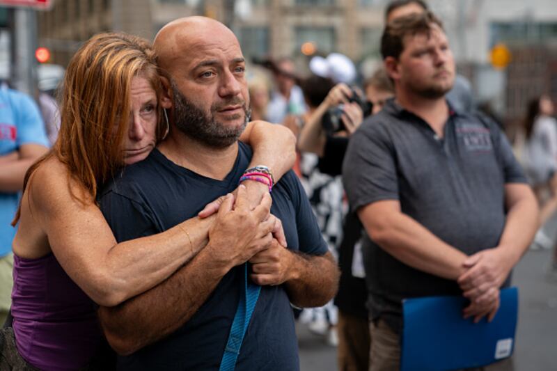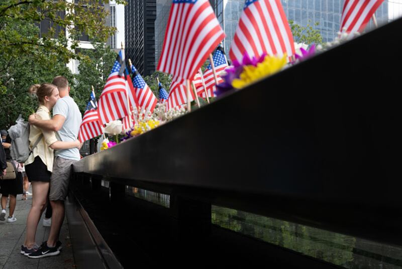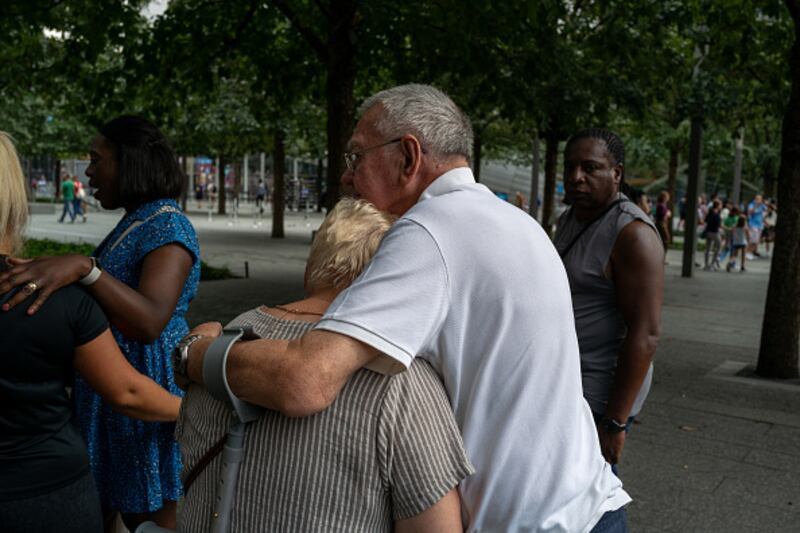 9/11 anniversary NEW YORK, NEW YORK - SEPTEMBER 11: Two people embrace during a moment of silence at Ground Zero on September 11, 2023 in New York City. Family and friends honored the lives of their lost loved ones on the 22nd anniversary of the terror attacks of September 11, 2001, at the World Trade Center, Shanksville, PA and the Pentagon, that killed nearly 3,000 people. (Photo by David Dee Delgado/Getty Images) (David Dee Delgado/Getty Images)