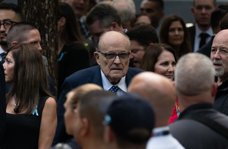 9/11 anniversary NEW YORK, NEW YORK - SEPTEMBER 11: Former New York City mayor Rudy Giuliani attends services at the 9/11 Memorial and Museum at the Ground Zero site in lower Manhattan as the nation commemorates the 22nd anniversary of the attacks on September 11, 2023 in New York City. Monday marks the 22nd anniversary of the September 11 terrorist attacks on the World Trade Center and the Pentagon, as well as the crash of United Airlines Flight 93. In total, the attacks killed nearly 3,000 people and commenced a global war on terror which included American led conflicts in both Iraq and Afghanistan. (Photo by Spencer Platt/Getty Images) (Spencer Platt/Getty Images)