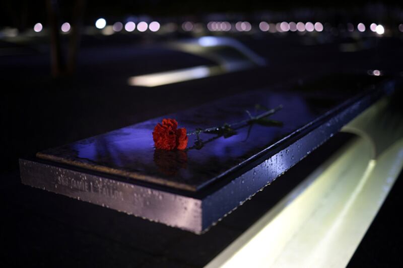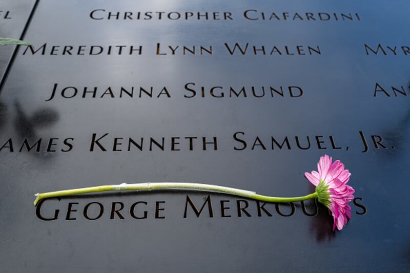 9/11 anniversary NEW YORK, NEW YORK - SEPTEMBER 11: A flower is left on a name at the 9/11 Memorial at the Ground Zero site in lower Manhattan as the nation commemorates the 22nd anniversary of the attacks on September 11, 2023 in New York City. Monday marks the 22nd anniversary of the September 11 terrorist attacks on the World Trade Center and the Pentagon, as well as the crash of United Airlines Flight 93. In total, the attacks killed nearly 3,000 people and commenced a global war on terror which included American led conflicts in both Iraq and Afghanistan. (Photo by Spencer Platt/Getty Images) (Spencer Platt/Getty Images)