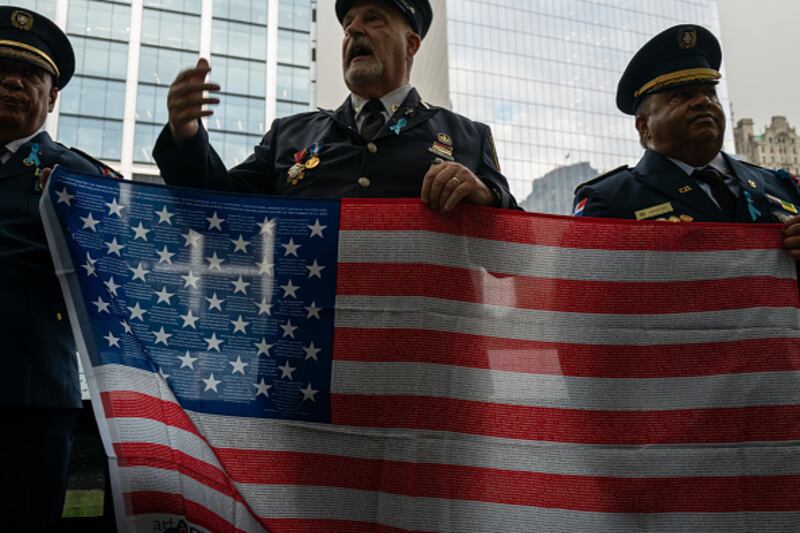 9/11 Anniversary NEW YORK, NEW YORK - SEPTEMBER 11: Retired firefighter Vincent Forras holds an American Flag with the names of September 11 victims while at the 9/11 Memorial at the Ground Zero site in lower Manhattan as the nation commemorates the 22nd anniversary of the attacks on September 11, 2023 in New York City. Monday marks the 22nd anniversary of the September 11 terrorist attacks on the World Trade Center and the Pentagon, as well as the crash of United Airlines Flight 93. In total, the attacks killed nearly 3,000 people and commenced a global war on terror which included American led conflicts in both Iraq and Afghanistan. (Photo by Spencer Platt/Getty Images) (Spencer Platt/Getty Images)