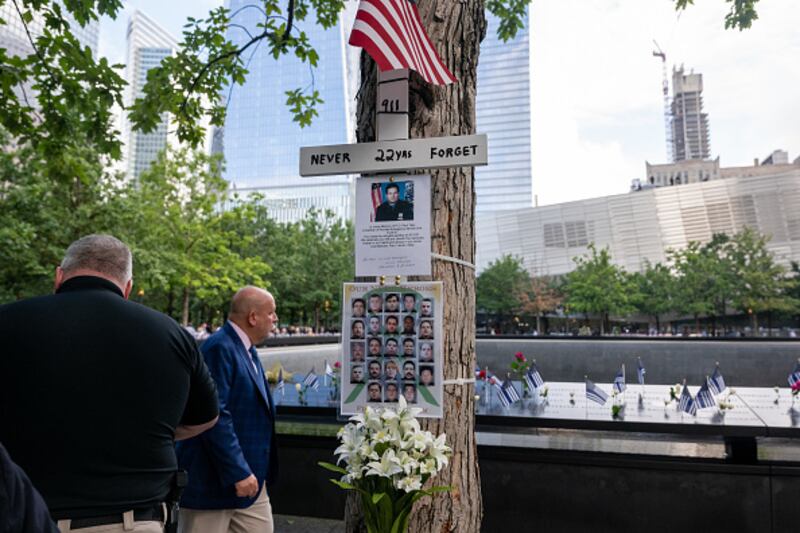 9/11 Anniversary NEW YORK, NEW YORK - SEPTEMBER 11: Police and firefighters visit the 9/11 Memorial at the Ground Zero site in lower Manhattan as the nation commemorates the 22nd anniversary of the attacks on September 11, 2023 in New York City. Monday marks the 22nd anniversary of the September 11 terrorist attacks on the World Trade Center and the Pentagon, as well as the crash of United Airlines Flight 93. In total, the attacks killed nearly 3,000 people and commenced a global war on terror which included American led conflicts in both Iraq and Afghanistan. (Photo by Spencer Platt/Getty Images) (Spencer Platt/Getty Images)