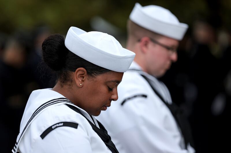 9/11 anniversary ARLINGTON, VIRGINIA - SEPTEMBER 11: Members of the Navy participate in a moment of silence during a ceremony observing the 9/11 terrorist attacks at the Pentagon on September 11, 2023 in Arlington, Virginia. The Defense Department held a remembrance ceremony for the 184 lives lost in the 2001 terrorist attack on the Pentagon. Today marks the 22nd anniversary of the September 11, 2001 terrorist attacks at the World Trade Center, the Pentagon, and Shanksville, Pennsylvania. (Photo by Win McNamee/Getty Images) (Win McNamee/Getty Images)