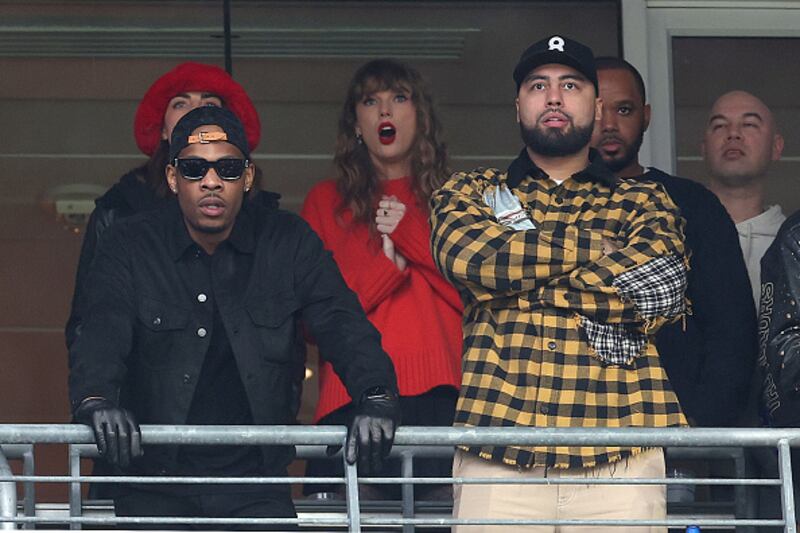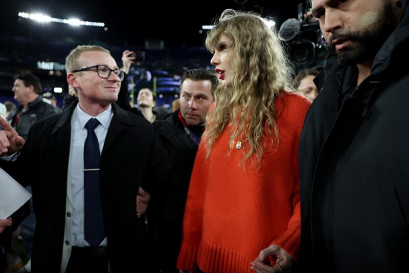 AFC Championship BALTIMORE, MARYLAND - JANUARY 28: Taylor Swift and Ross Travis look on during the second quarter in the AFC Championship Game between the Baltimore Ravens and the Kansas City Chiefs at M&T Bank Stadium on January 28, 2024 in Baltimore, Maryland. (Photo by Rob Carr/Getty Images) (Rob Carr/Getty Images)