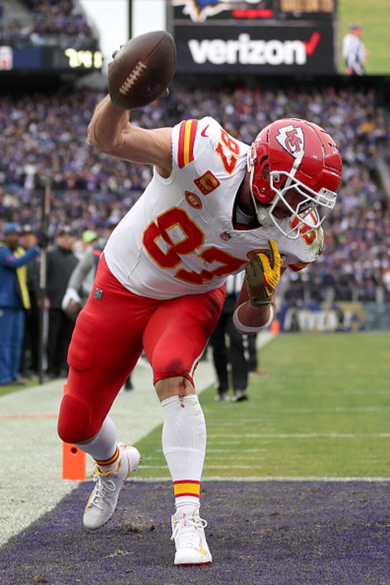 AFC Championship BALTIMORE, MARYLAND - JANUARY 28: Travis Kelce #87 of the Kansas City Chiefs celebrates after catching a touchdown pass against the Baltimore Ravens during the first quarter in the AFC Championship Game at M&T Bank Stadium on January 28, 2024 in Baltimore, Maryland. (Photo by Patrick Smith/Getty Images) (Patrick Smith/Getty Images)