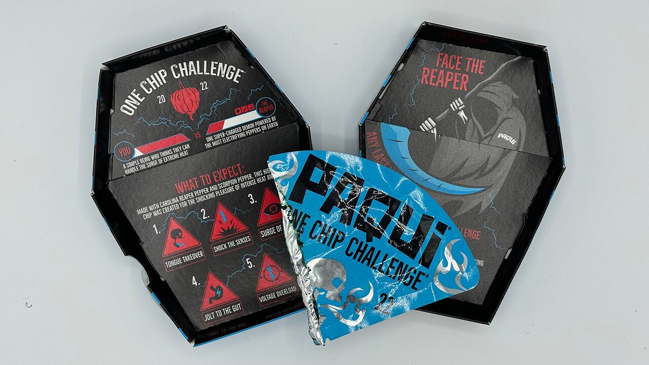 The “One Chip Challenge” gained popularity on social media, with people posting videos of themselves or friends reacting after eating the single chip. It was made with two of the world’s spiciest peppers and sold in a box shaped to look like a coffin.
